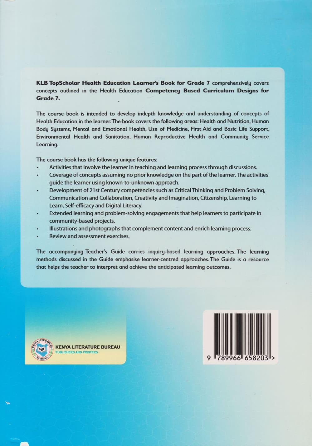 Summary: The KLB TOP SCHOLAR HEALTH EDUCATION GD7 is designed to support Grade 7 learners in developing essential health education skills. Published by the Kenya Literature Bureau, this book aligns with the Competency-Based Curriculum. It covers key concepts such as personal hygiene, nutrition, physical fitness, and mental health. It aims to equip learners with practical knowledge and skills to maintain a healthy lifestyle and promote well-being.