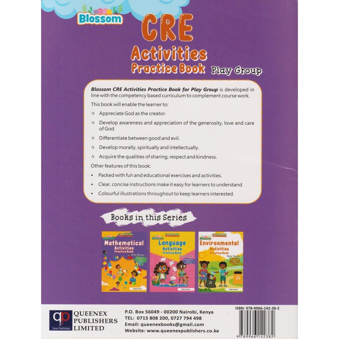 Queenex Blossom CRE Act Practice Play Grp by Queenex Publishers Ltd: A workbook designed for Playgroup learners to develop moral, spiritual, and intellectual growth through engaging activities and colorful illustrations.