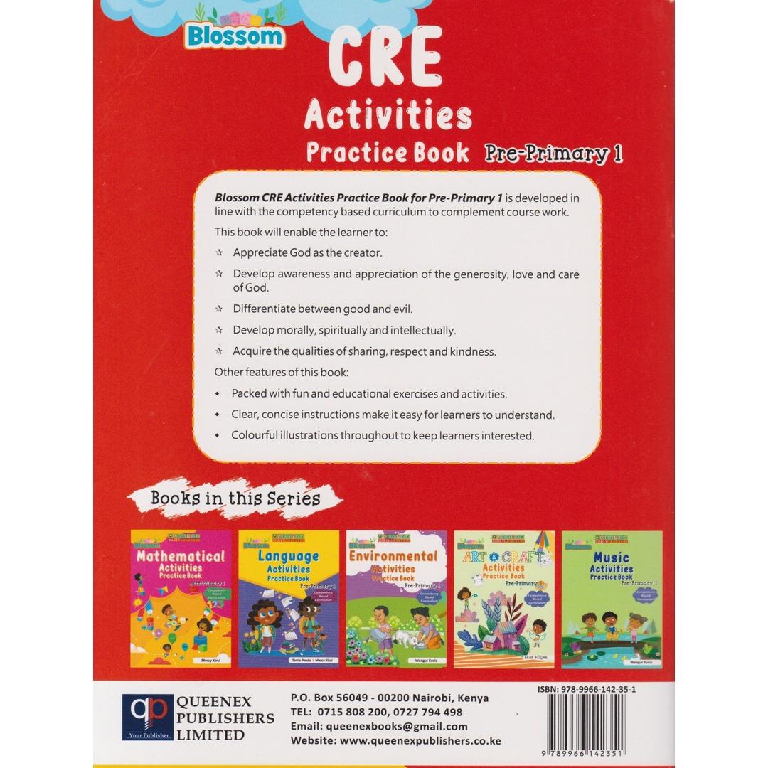 Queenex Blossom CRE Act Practice PP1 by Queenex Publishers Ltd: A workbook tailored for PP1 learners, designed to nurture moral and spiritual growth through fun and engaging activities.