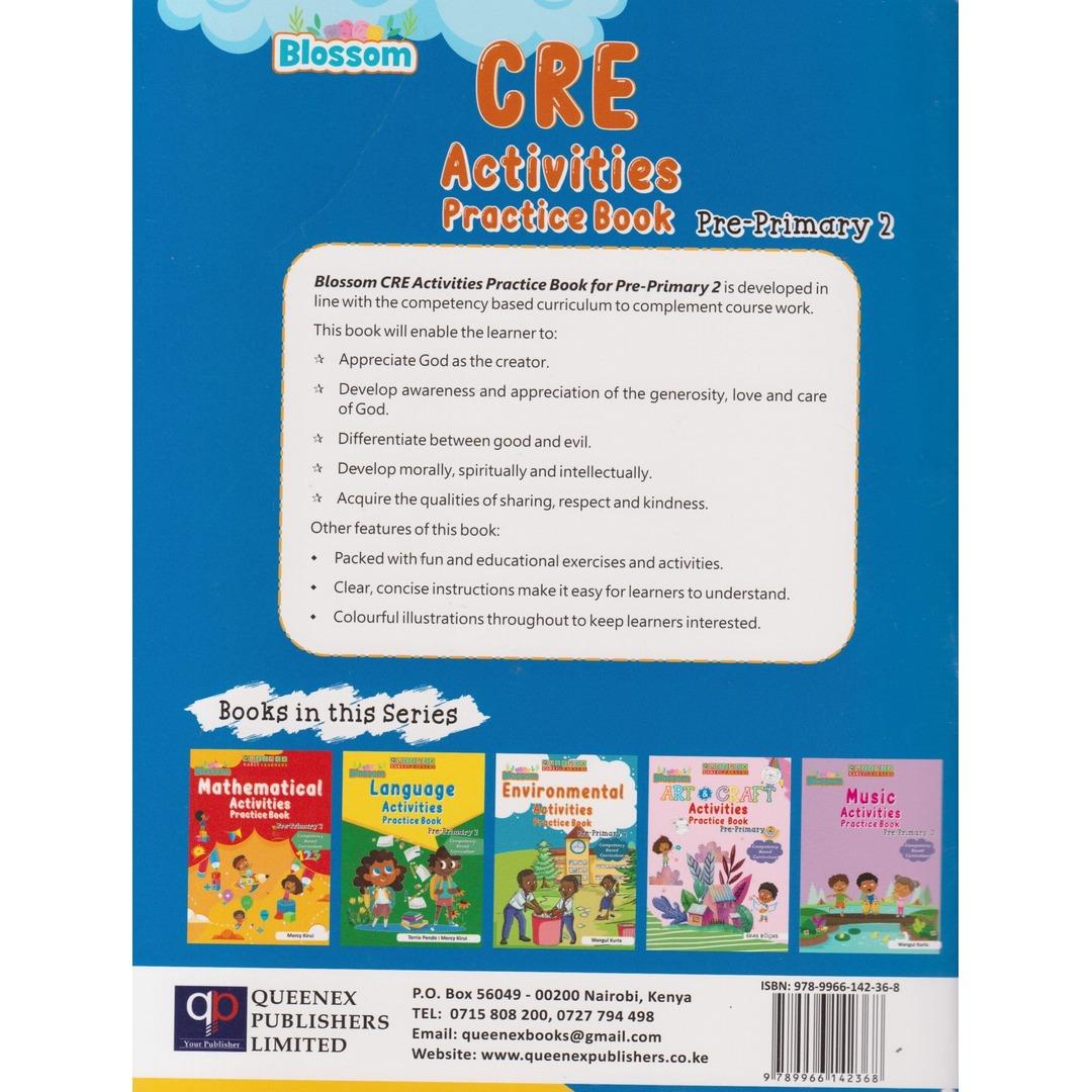 Queenex Blossom CRE Act Practice PP2 by Queenex Publishers Ltd: A workbook specially crafted for PP2 learners, fostering moral, spiritual, and intellectual development through interactive and enjoyable activities.