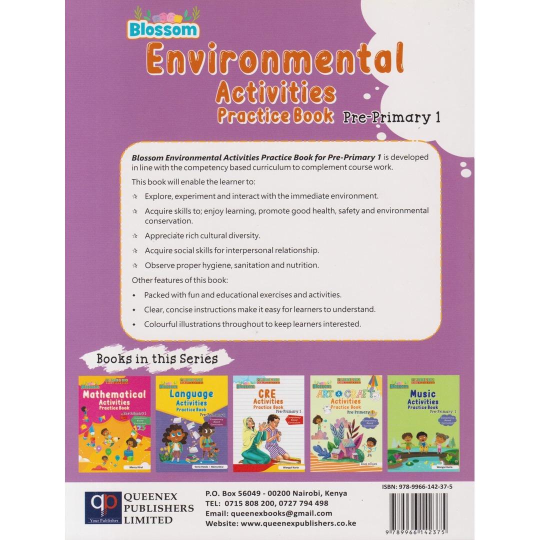 Queenex Blossom Environmental Act Practice PP1 by Queenex Publishers Ltd: A workbook designed to enhance PP1 learners' environmental awareness and practical skills through fun and interactive activities, fostering care for their surroundings.