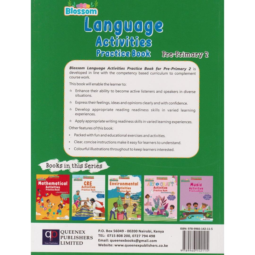 Queenex Blossom Language Act Practice PP2 by Queenex Publishers Ltd: A workbook created to enhance PP2 learners' language and literacy development through interactive, engaging, and skill-building activities.
