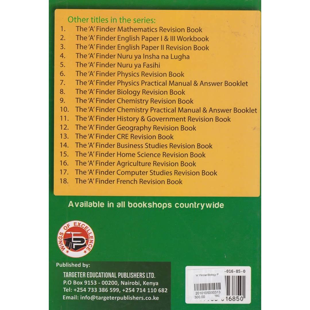 A' Finder Biology Practical Manual by Targeter Educational Publishers Ltd: A KCSE-aligned resource offering step-by-step guidance on core experiments, observations, and practical assessments for Biology students in Form 2 to Form 4.