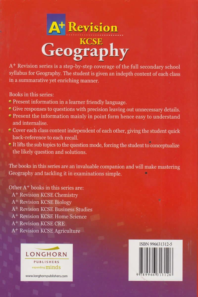 A+ Revision series is a step-by-step coverage of the full secondary school syllabus for Geography. The student is given an in-depth content of each class in a summarative yet enriching manner.