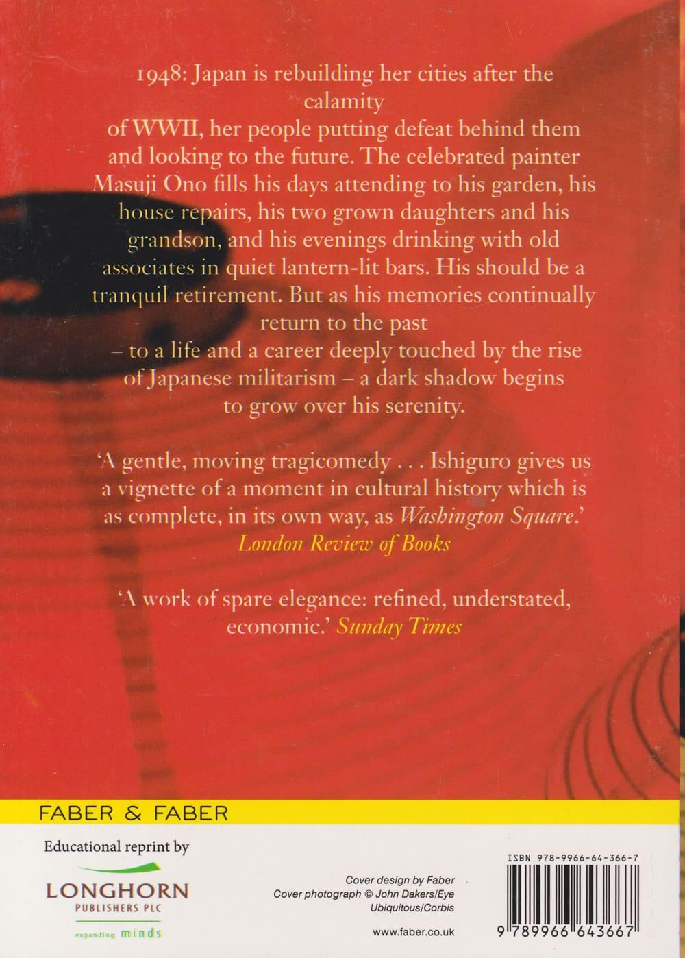 1948: Japan is rebuilding her cities after the calamity; of WWII, her people putting defeat behind them and looking to the future. The celebrated painter Masuji Ono fills his days attending to his garden, his house repairs, his two grown daughters and his erandson, and his evenings drinking with old associates in quiet lantern-lit bars. His should be a tranquil retirement. But as his memories continually return to the past to life and a career deeply touched by the rise of Japanese militarism — a dark shadow begins to grow over his serenity.