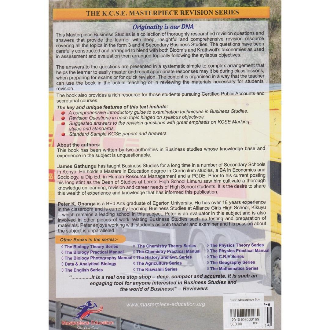 KCSE Masterpiece Business Studies Form 3 & 4 by Masterpiece Productions: A comprehensive revision workbook for Form 3 and 4 students, designed to cover key Business Studies concepts and aid KCSE preparation.