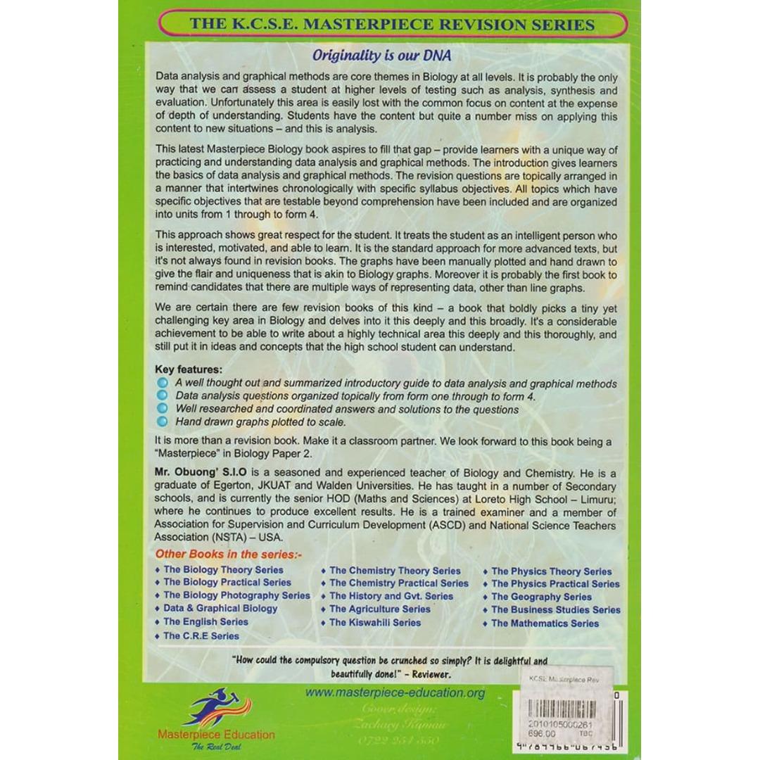 KCSE Masterpiece Rev Biology Data Analysis by Masterpiece Productions: A resource designed for Form 2 to Form 4 students, focusing on data analysis techniques essential for mastering Biology concepts and excelling in KCSE exams.