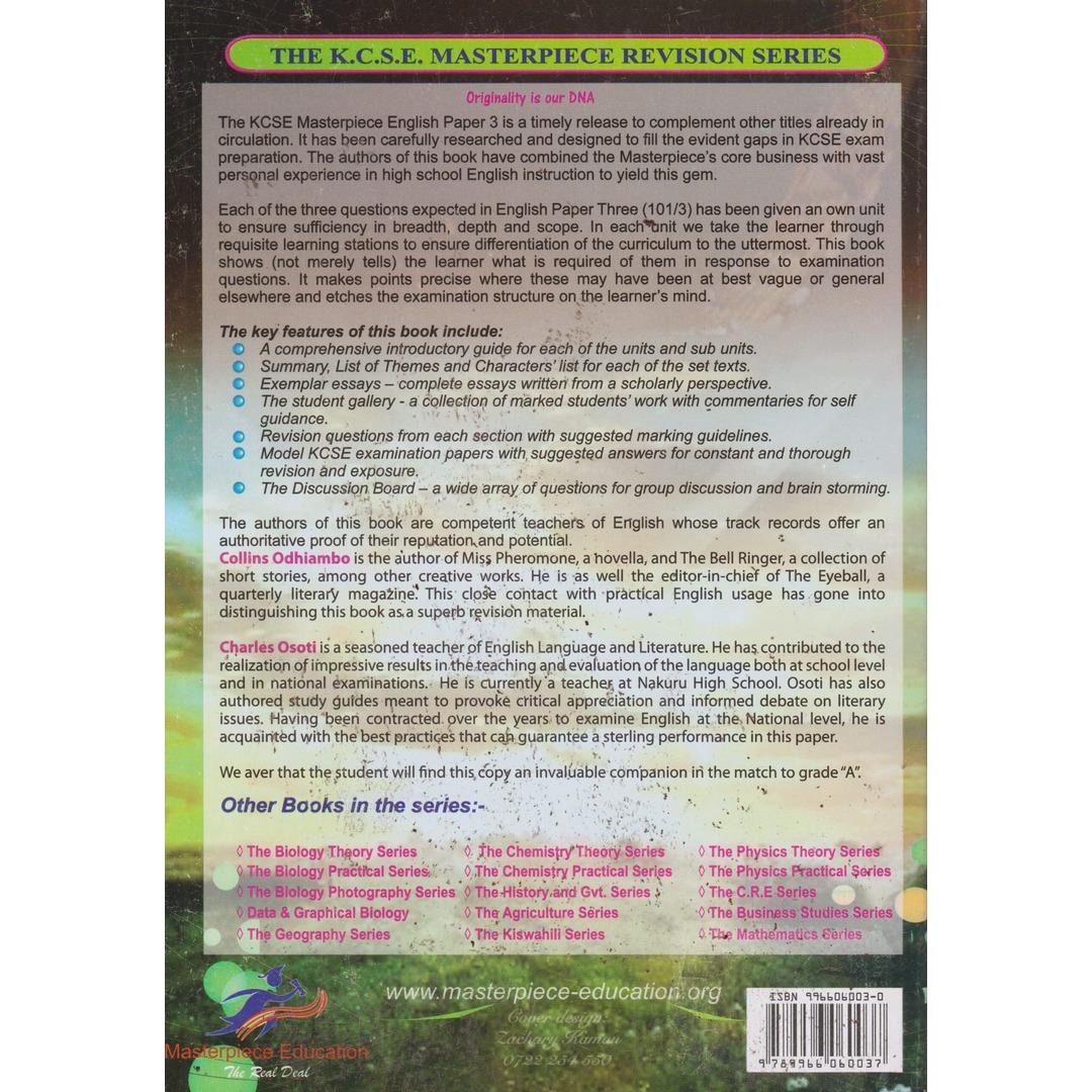 KCSE Masterpiece Revision English Paper 3 Form 2 - 4 by Masterpiece Productions: A comprehensive workbook for Forms 2 to 4 students, emphasizing key concepts and writing skills essential for excelling in English Paper 3 and the KCSE exams.