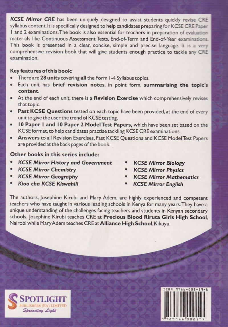 KCSE Mirror CRE has been uniquely designed to assist students quickly revise CRE syllabus content. It is specifically designed to help candidates preparing for KCSE CRE Paper I and 2 examinations.The book is also essential for teachers in preparation of evaluation materials like Continuous Assessment Tests, End-of-Term and End-of-Year examinations. This book is presented in a clear, concise, simple and precise language. It is a very comprehensive revision book that will give students enough practice to tackle any CRE examination.