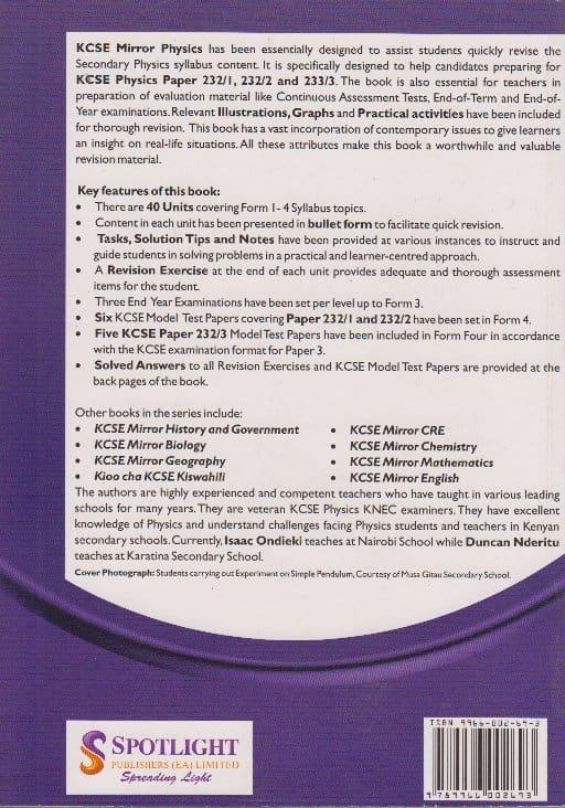 KCSE Mirror Physics has been essentially designed to assist students quickly revise the Secondary Physics syllabus content. It is specifically designed to help candidates preparing for KGSE Physics Paper 232/1, 232/2 and 233/3