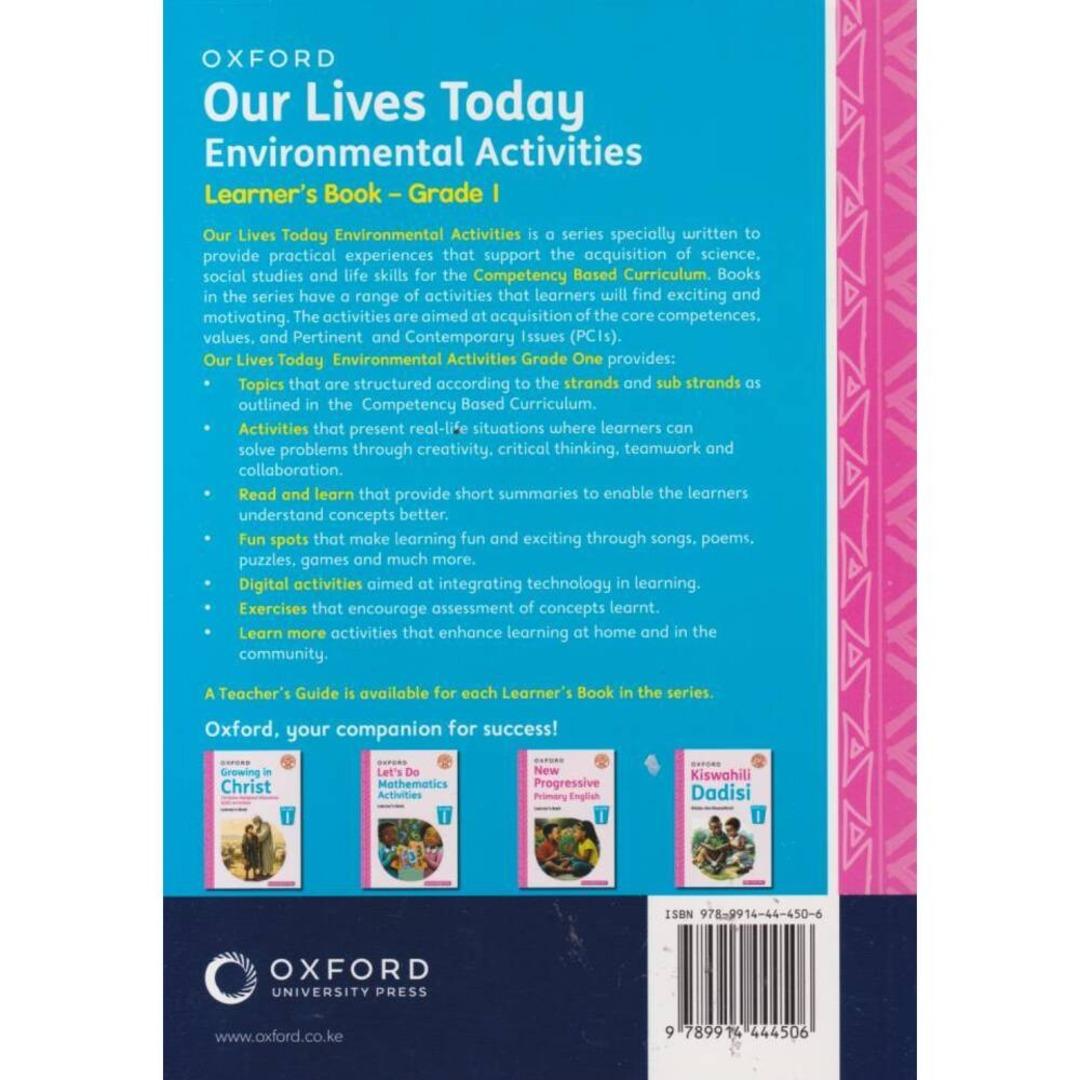 Our Lives Today Environmental Activities is a series specially written to provide practical experiences that support the acquisition of science, social studies and life skills for the Competency Based Curriculum. Books in the series have a range of activities that learners will find exciting and motivating. The activities are aimed at acquisition of the core competences, values, and Pertinent and Contemporary Issues (PC1s).