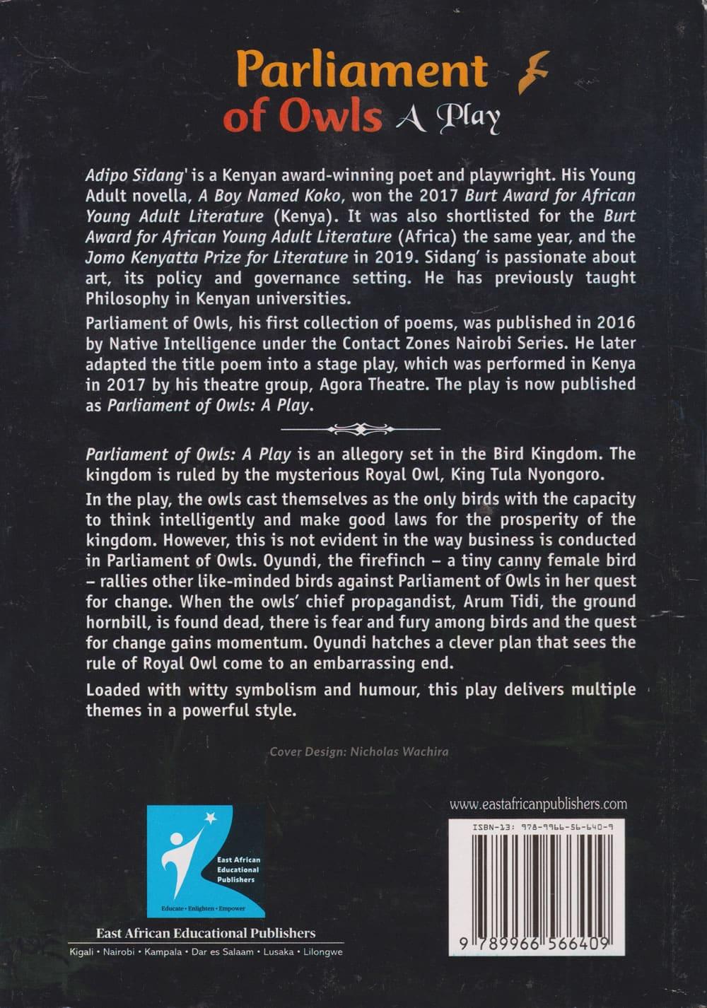 Parliament of Owls, his first collection of poems, was published in 2016 by Native Intelligence under the Contact Zones Nairobi Series. He later adapted the title poem into a stage play, which was performed in Kenya in 2017 by his theatre group, Agora Theatre. The play is now published as Parliament of Owls: A Play.