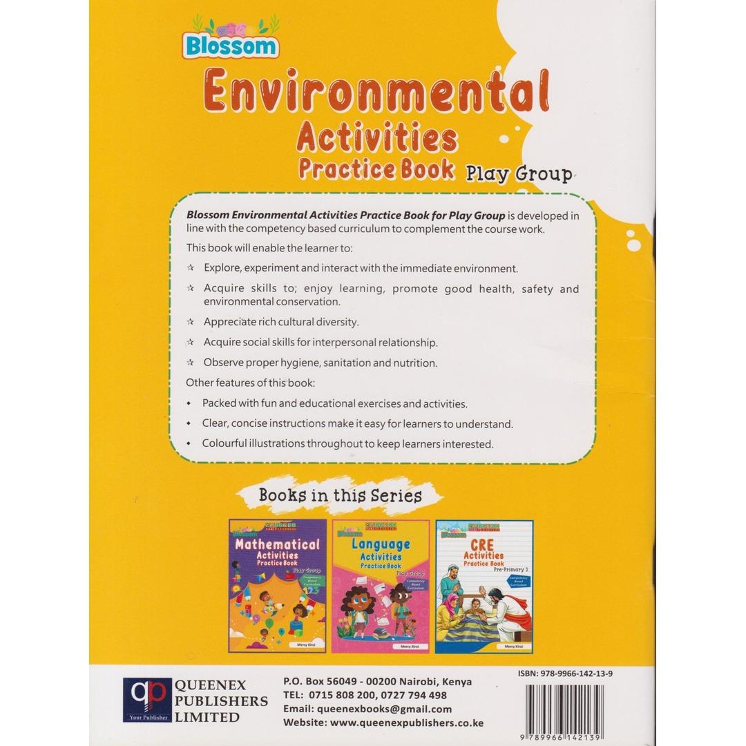Queenex Blossom Environmental Act Practice Play Grp by Queenex Publishers Ltd: A workbook designed to introduce Playgroup learners to environmental awareness and practical activities, nurturing care for the environment through interactive and engaging exercises.