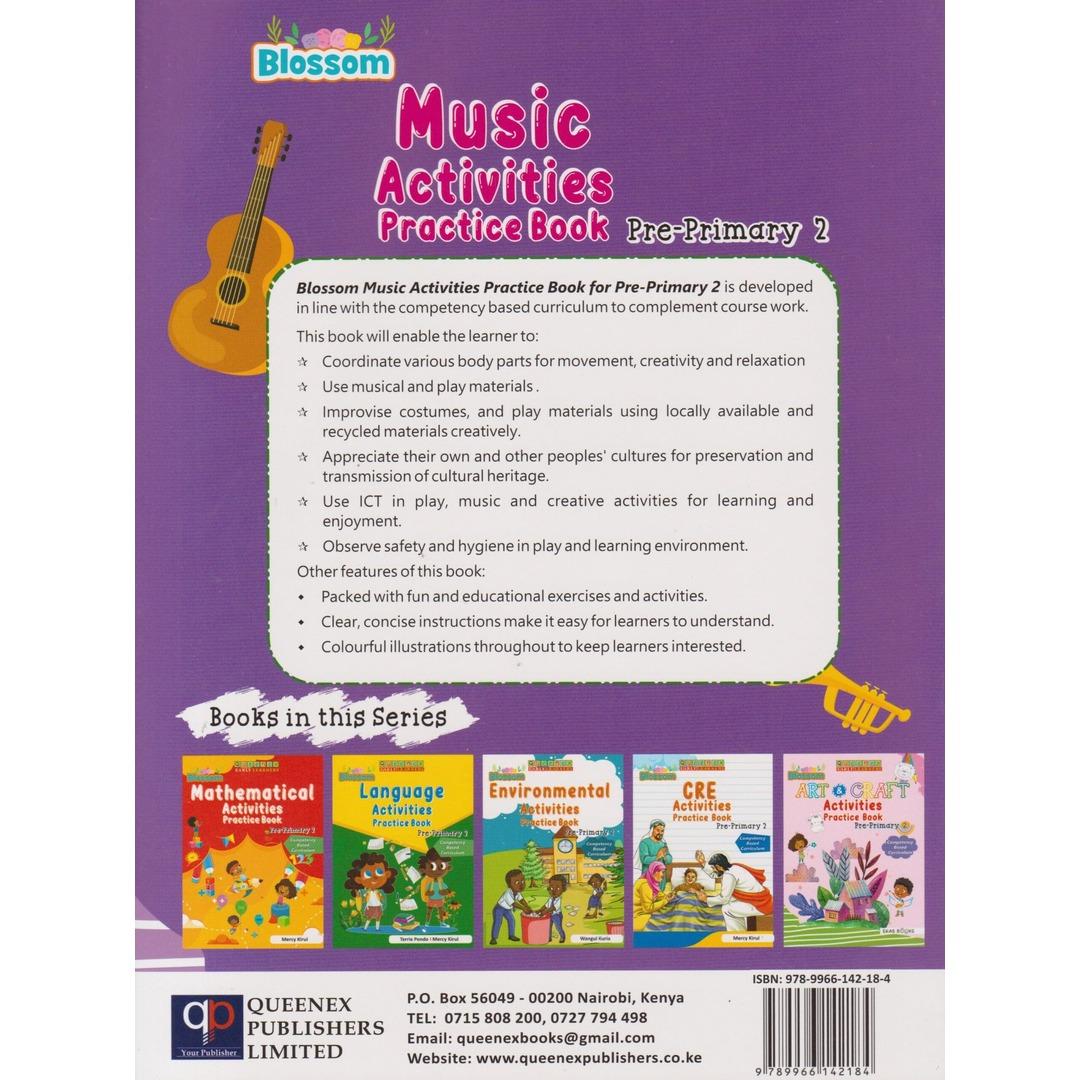Queenex Blossom Music Act Practice PP2 by Queenex Publishers Ltd: Engaging workbook designed to nurture early music skills and creativity in PP2 learners.