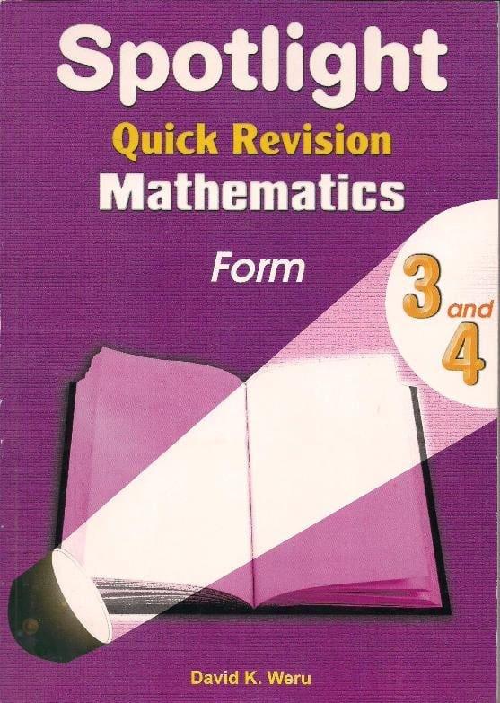 Spotlight Quick Revision Math Form 3 and 4 has been uniquely designed to assist students quickly revise Mathematics topics taught at these levels.lt is also intended to help candidates revising for their KCSE Mathematics Papers The book is also essential for teachers in the preparation of evaluation materials like Continuous Assessment Tests, End-of-Term and End-of-Year examinations. This book is presented in a clear, simple and precise language that makes revision stimulating and interesting.Â