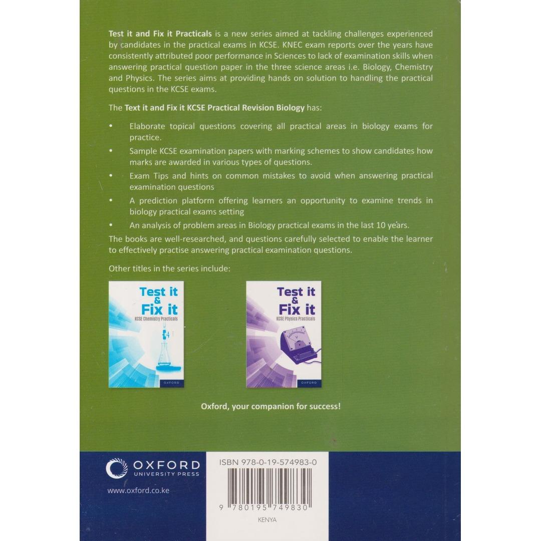 Test it & Fix it KCSE Biology Practicals (Oxford) by Oxford University Press: Provides hands-on practical exercises and structured revision to enhance mastery of KCSE biology practicals.