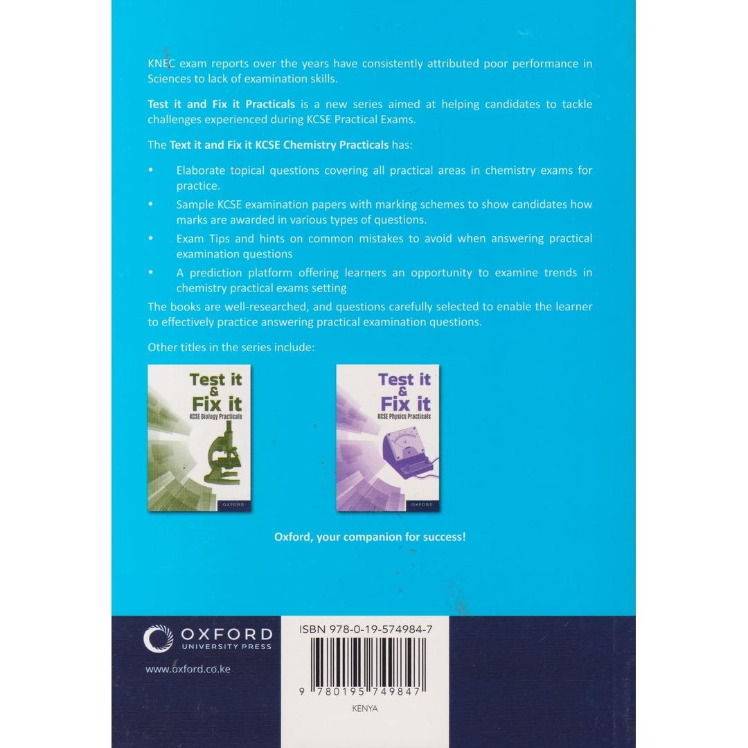 Test it & Fix it KCSE Chemistry Practicals (Oxford) by Oxford University Press: Strengthens understanding of chemistry experiments with structured practical exercises tailored for KCSE exam preparation.